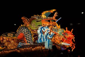で、おかげさまで、東北の岩手県盛岡市で「さんさ踊り」、青森県の青森市で「ねぶた祭り」、秋田県の秋田市で「竿燈まつり」、宮城県仙台市で「七夕祭り」を楽しむことができました。美味しいものもいっぱい食べました。みそたんぽ(きりたんぽ)、稲庭うどん、牛タン定食などなど。田沢湖と角館にも立ち寄って、いろいろと楽しい時間が過ごせました。心配していた雨も、バスで移動中は少し降ったけど各エリアに到着すると晴れて、雨に振られることもなく予定通り進めることができました。とにかく「みんなで盛り上げる」という熱気が半端なく、また日本の一面を体験できました。ちょっと暑かったけどノー・プロブレムです。同行した(団体)チームの方が「なにか枷が外れた気がする」と話していましたが、なるほどそういう受け取り方もできるのか、と思いました。